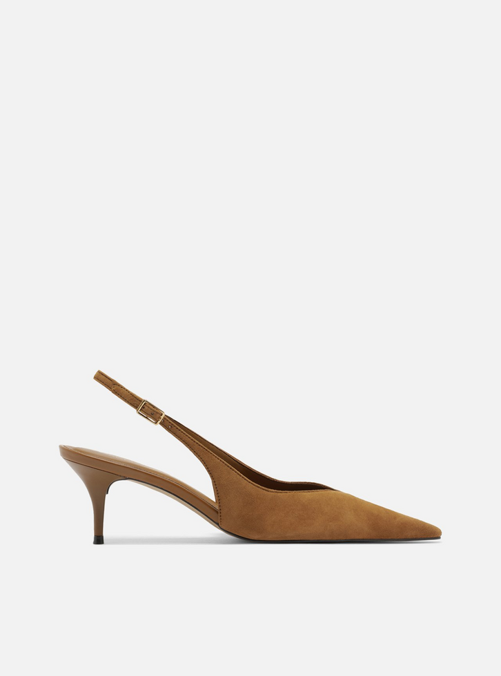 Scarpin marrom em camurça. O sapato tem salto baixo fino e ponta fina. Fechado, traz cabedal com recorte em V sobre a parte superior do pé. Traz tira fina conectada ao cabedal, que segue pelas laterais e contorna o calcanhar, com elástico. Com palmilha de couro da cor do calçado e inscrição do nome da marca.