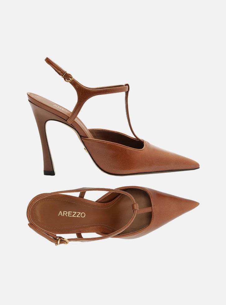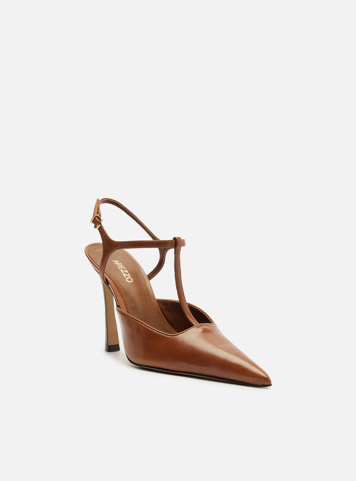 Scarpin marrom em couro. O sapato tem salto alto fino, ponta fina e cabedal fechado. Traz tira fina na parte superior do pé conectada ao cabedal, presa à tira que contorna o tornozelo e fecha em fivela metálica. Com palmilha da cor do sapato e inscrição do nome da marca.