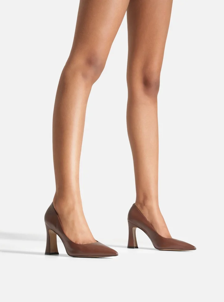 Scarpin marrom de couro. O sapato tem salto alto bloco flare e formato fino na ponta. Fechado, traz cabedal com recorte arredondado sobre a parte superior do pé. Com palmilha bege e inscrição do nome da marca, exibe toda a parte superior do pé.