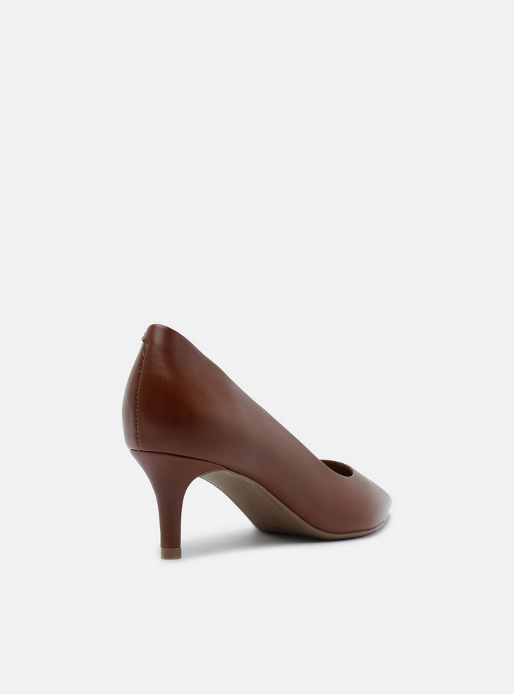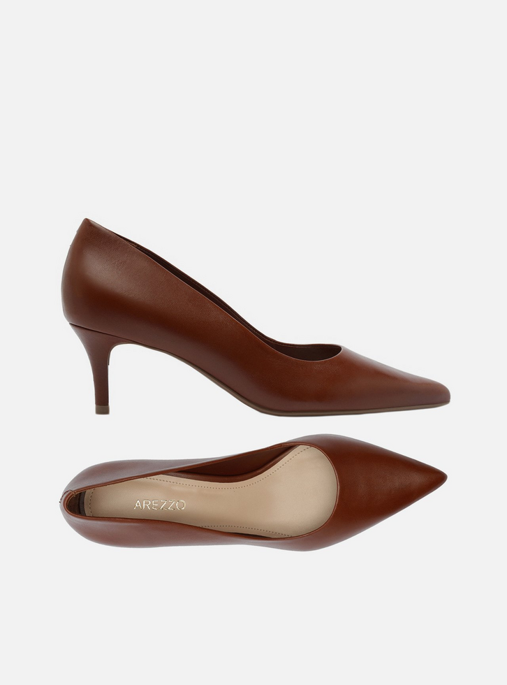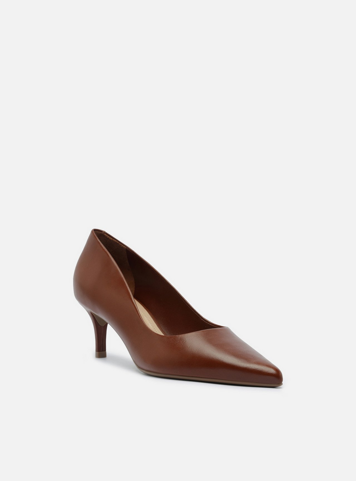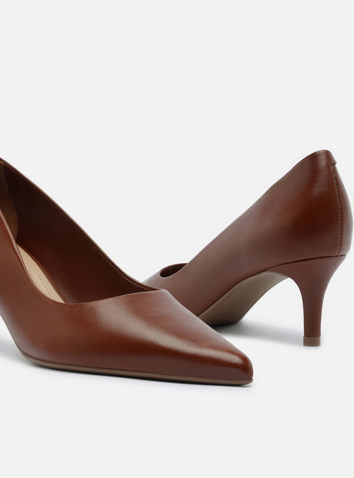 Scarpin de couro marrom. O sapato tem salto médio fino e ponta fina. Fechado, traz cabedal com recorte arredondado sobre a parte superior do pé e formato ajustado nas laterais. Com palmilha bege e inscrição do nome da marca.