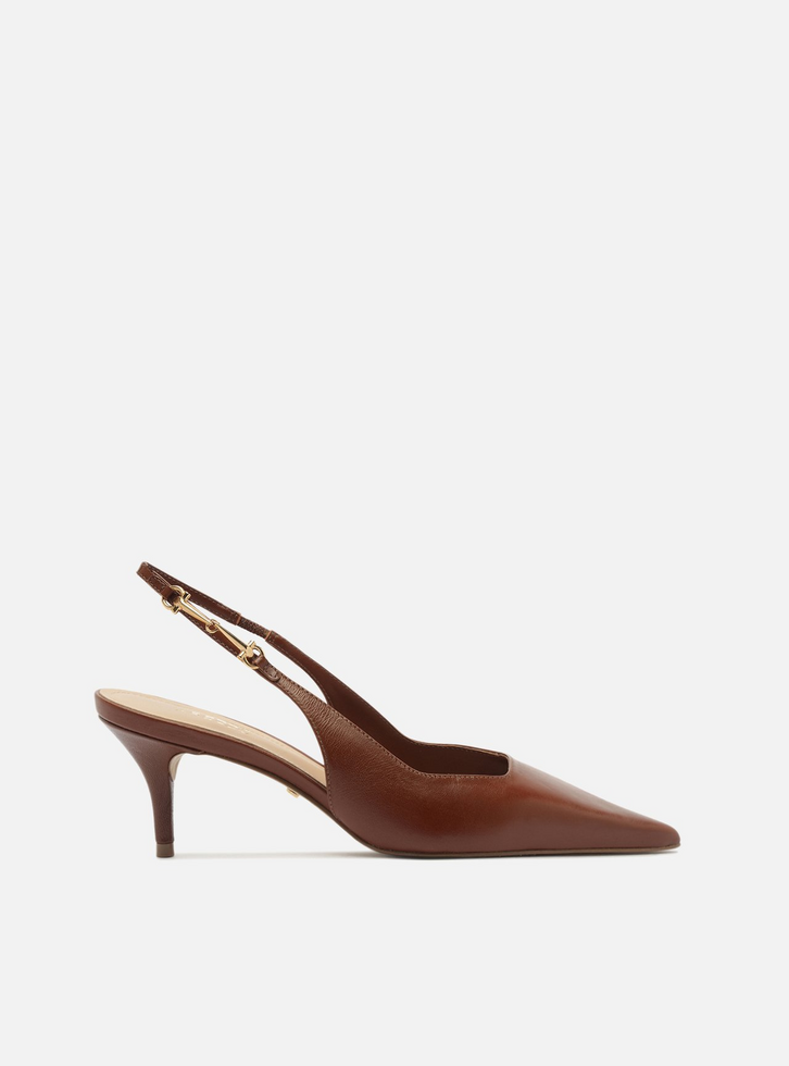 Scarpin marrom de couro. O sapato tem salto baixo fino e ponta fina. Fechado, possui recorte geométrico sobre o cabedal. Traz tira fina conectada ao cabedal que segue pelas laterais e contorna o calcanhar, com detalhe lateral em metal. Com palmilha marrom e inscrição do nome da marca, exibe toda parte superior do pé e calcanhar.