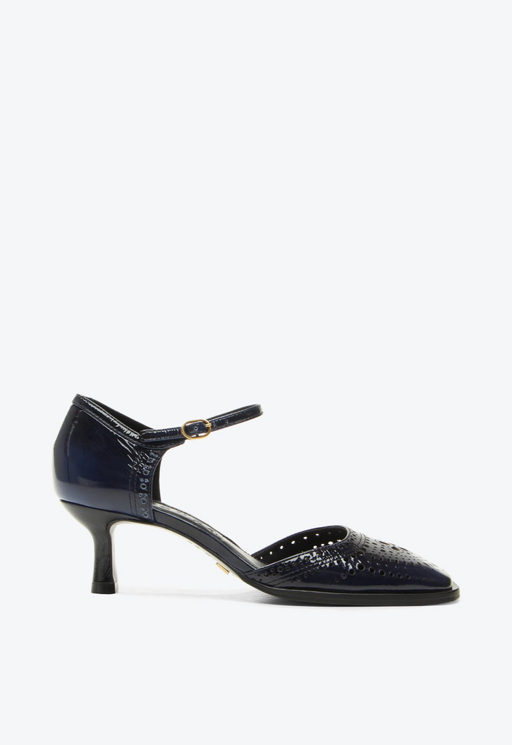 Scarpin de salto médio em verniz azul. Esse modelo destaca-se pela elegância atemporal e pelo brilho sofisticado, enquanto o design de recortes a laser adiciona um toque moderno e exclusivo. Ideal para quem busca um estilo versátil e marcante. Perfeito para compor looks com vestidos midi ou calças de alfaiataria.