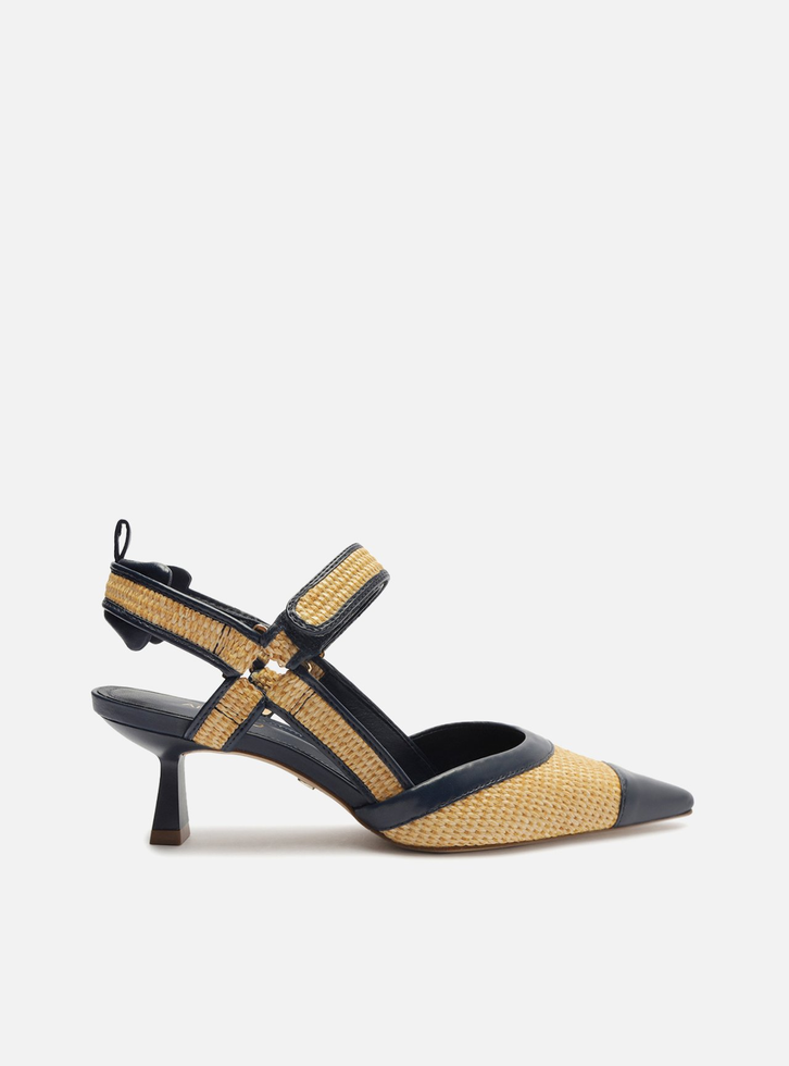 Scarpin bege em tecido tramado. O modelo tem salto médio fino e bico fino. Aberto atrás, possui cabedal em tecido tramado e detalhe em azul. Traz tira fina conectada ao cabedal que segue pelas laterais, se conecta a fivelas e a outra tira que contorna o calcanhar. Possui fecho em tira com velcro no peito do pé. Com palmilha azul e inscrição do nome da marca, exibe todo o peito do pé e calcanhar.