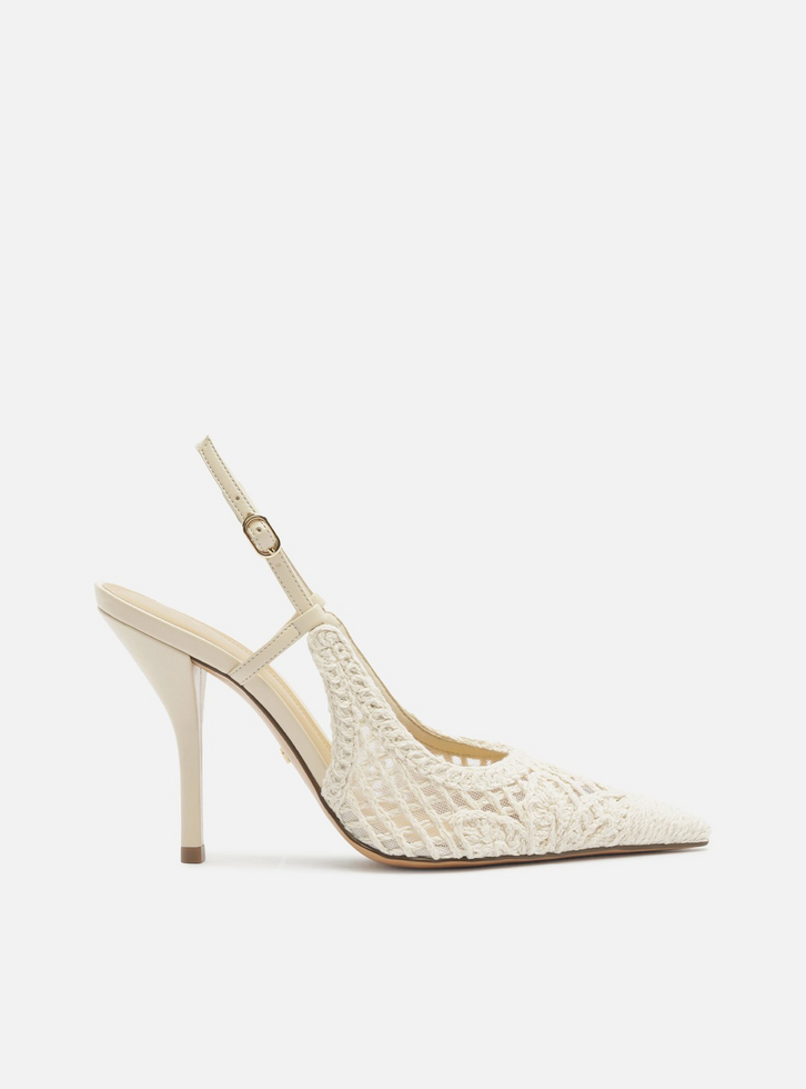 Scarpin Off White Bordado Salto Alto Fino Slingback