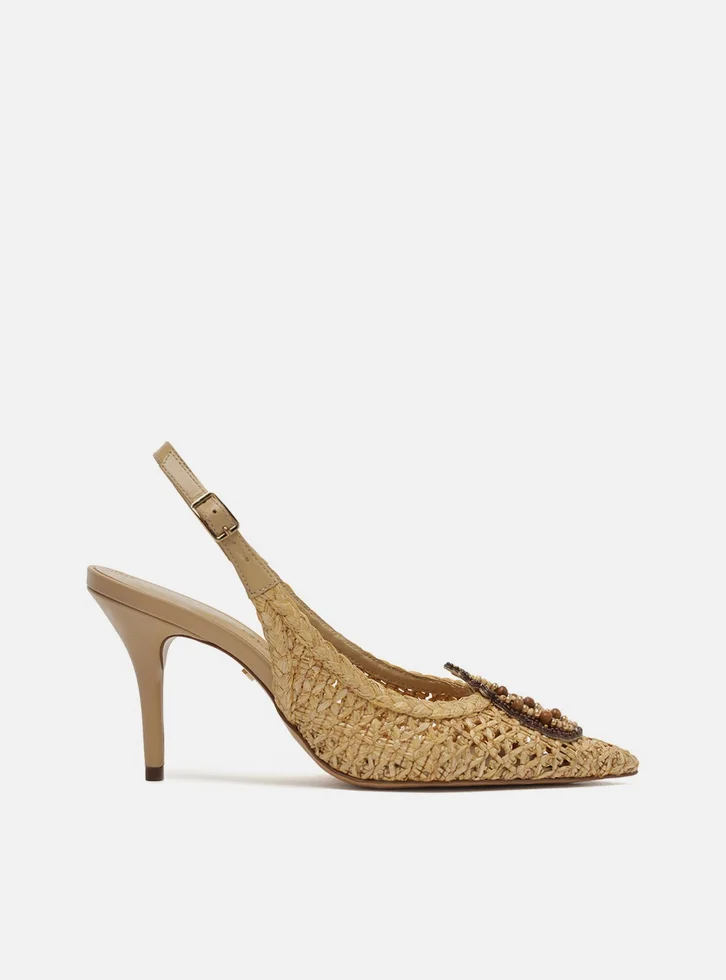 Scarpin Palha Tressê Salto Fino Slingback Pedraria