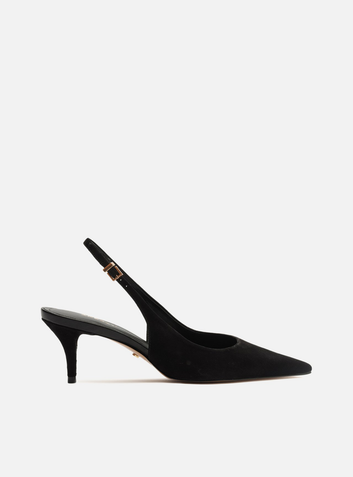 Scarpin feminino preto acamurçado. O sapato tem salto baixo fino e ponta fina. Fechado, possui recorte arredondado sobre o cabedal. Traz tira fina conectada ao cabedal, que segue pelas laterais e contorna o calcanhar, fechando em fivela metálica. Com palmilha lisa em couro e inscrição do nome da marca, exibe toda a parte superior do pé e calcanhar.