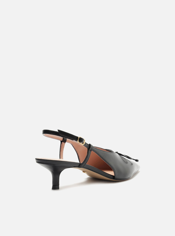 Scarpin preto de couro. O sapato tem salto baixo fino e ponta fina. Traz cabedal fechado, com recorte em V e aplicação de laço pequeno. Possui tira fina conectada ao cabedal, que segue pelas laterais, contorna o calcanhar e fecha em fivela metálica. Com palmilha bege e inscrição do nome da marca. Exibe a parte superior do pé e o calcanhar.