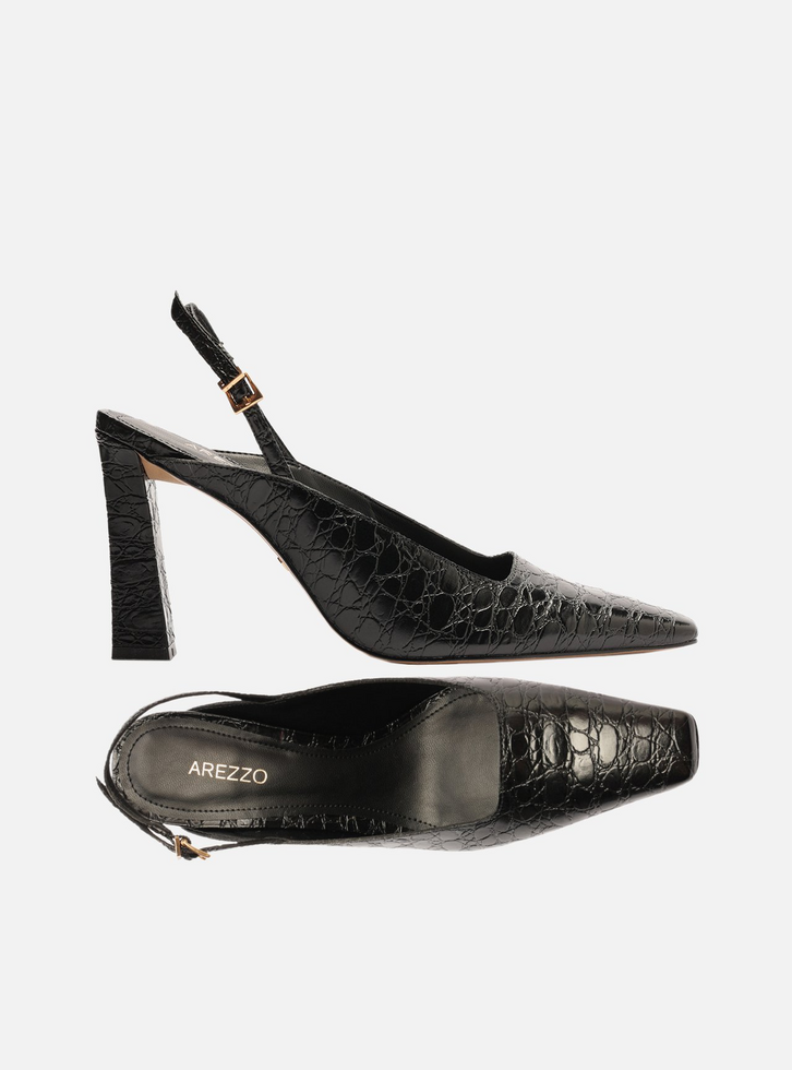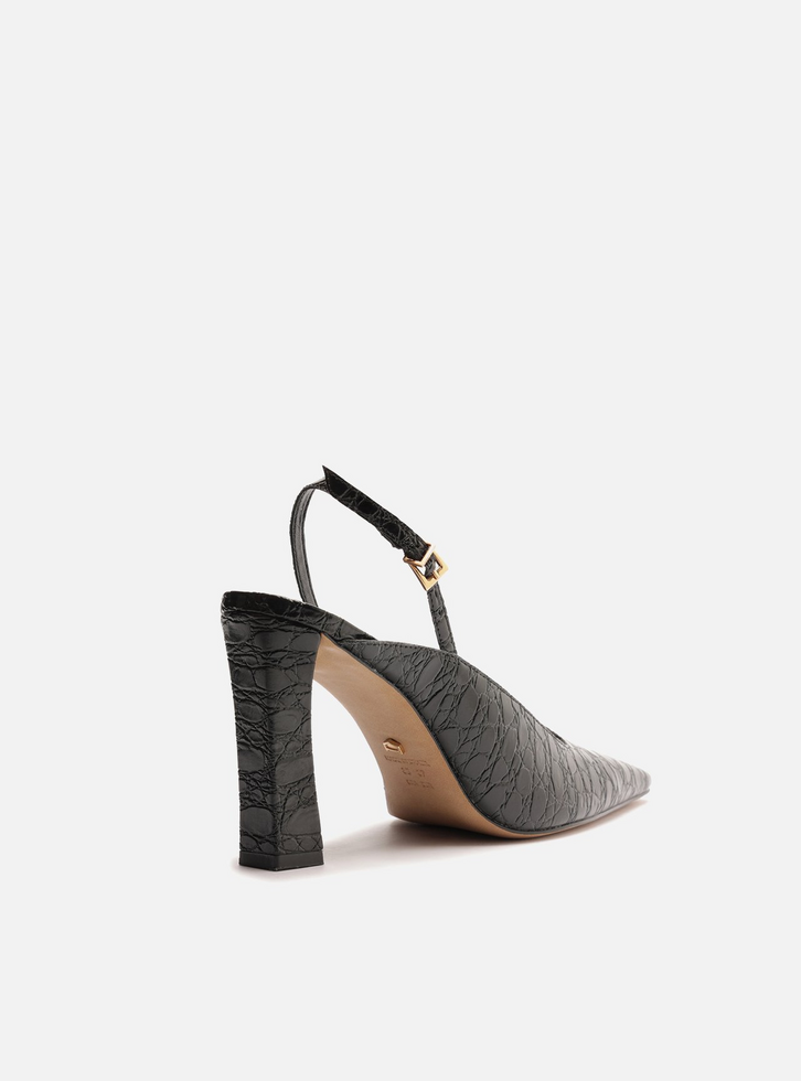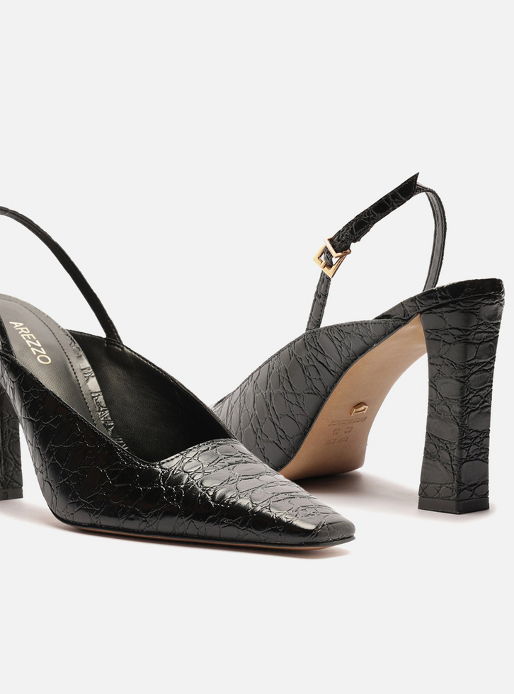 Scarpin preto croco. O sapato tem salto alto e bico fino quadrado. Aberto atrás, possui recorte quadrado no cabedal. Traz tira fina conectada ao cabedal que segue pelas laterais e contorna o calcanhar, fechando em fivela metálica. Com palmilha da cor do modelo e inscrição do nome da marca, exibe toda parte superior do pé e calcanhar.
