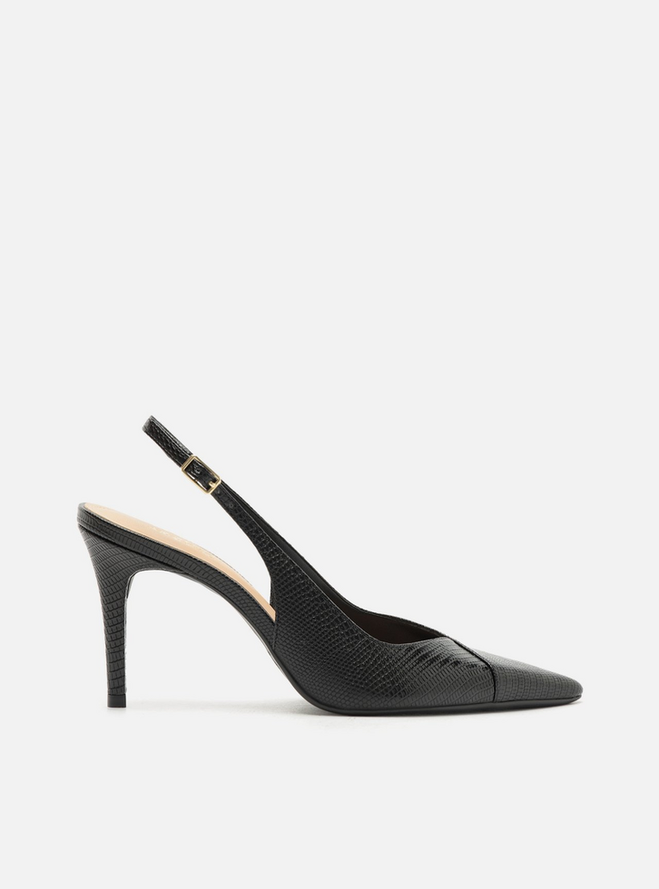 Scarpin preto em material texturizado lizard. O sapato tem salto médio fino e ponta fina. Fechado, traz cabedal com recorte em V sobre a parte superior do pé. Traz tira fina conectada ao cabedal que segue pelas laterais e contorna o calcanhar, fechando em fivela metálica. Com palmilha bege e inscrição do nome da marca.