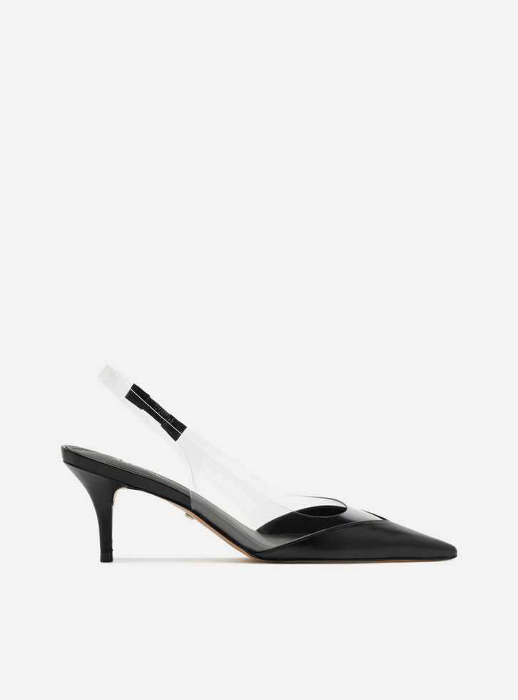 Scarpin feminino preto com recortes em vinil transparente. O modelo possui salto baixo fino e bico alongado. Conta com tira em vinil que envolve as laterais e calcanhar.