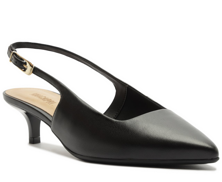 Scarpin de salto fino, na cor preta. O modelo, de material similar ao couro, possui salto médio e bico fino. Aberto atrás, traz tiras finas conectadas ao cabedal que seguem pelas laterais em elástico. Essas mesmas tiras seguem até a parte traseira e contornam o calcanhar, presas pelas tiras de apoio fixas nas laterais. Com palmilha nude e assinatura Anacapri, o scarpin deixa o peito do pé e calcanhar à mostra.