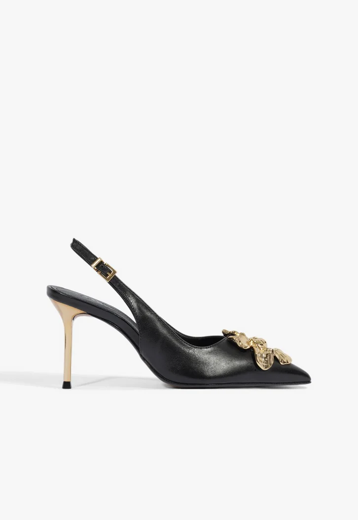 Delicado e sofisticado, este scarpin slingback preto combina a elegante construção em couro com o luxuoso enfeite metalizado - uma flor dourada que valoriza o design com bico fino. Por sua vez, o salto alto fino metalizado garante um toque moderno e refinado ao look. Com fechamento por fivela ajustável, é a escolha ideal para compor looks femininos com personalidade e elegância!
