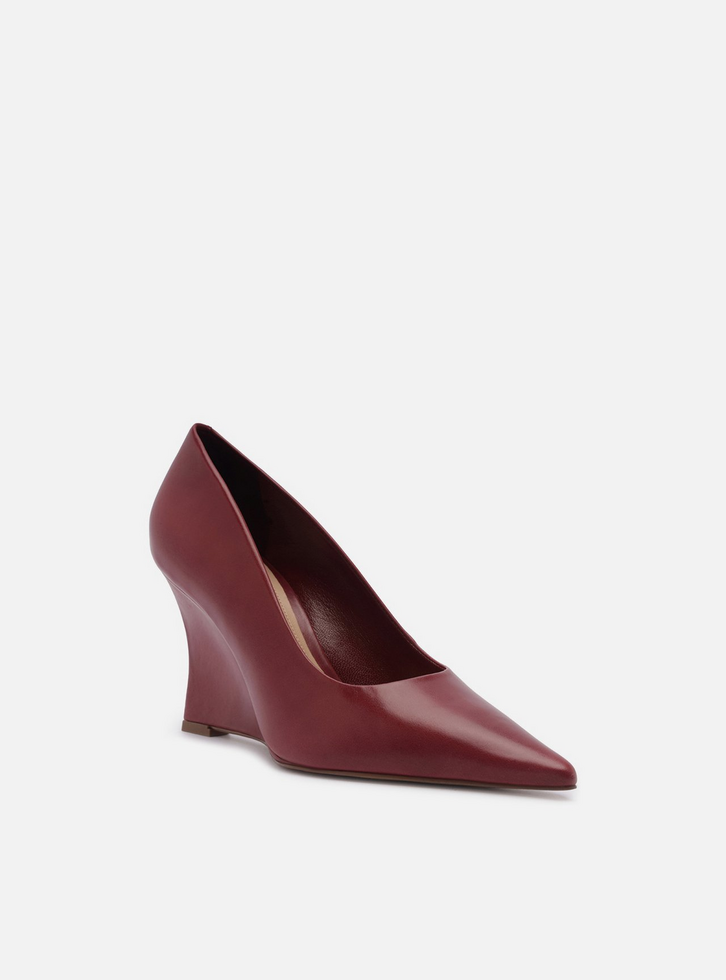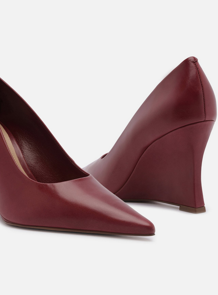 Scarpin feminino vermelho de couro. O sapato tem salto alto anabela e ponta fina. Fechado, traz cabedal com recorte arredondado na parte superior do pé e formato ajustado nas laterais. Com palmilha da cor do sapato e inscrição do nome da marca. Exibe toda a parte superior do pé.