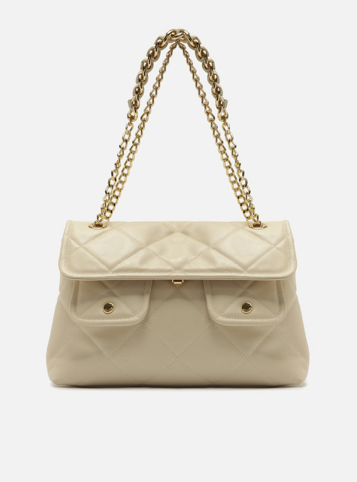 Bolsa feminina shoulder grande branca de couro. O acessório tem formato estruturado e acabamento em matelassê. Traz alça de ombro curta em corrente metálica com tira de couro entrelaçada. O fecho é em tampo frontal. Conta com bolsos sob o tampo e fecho em botões.