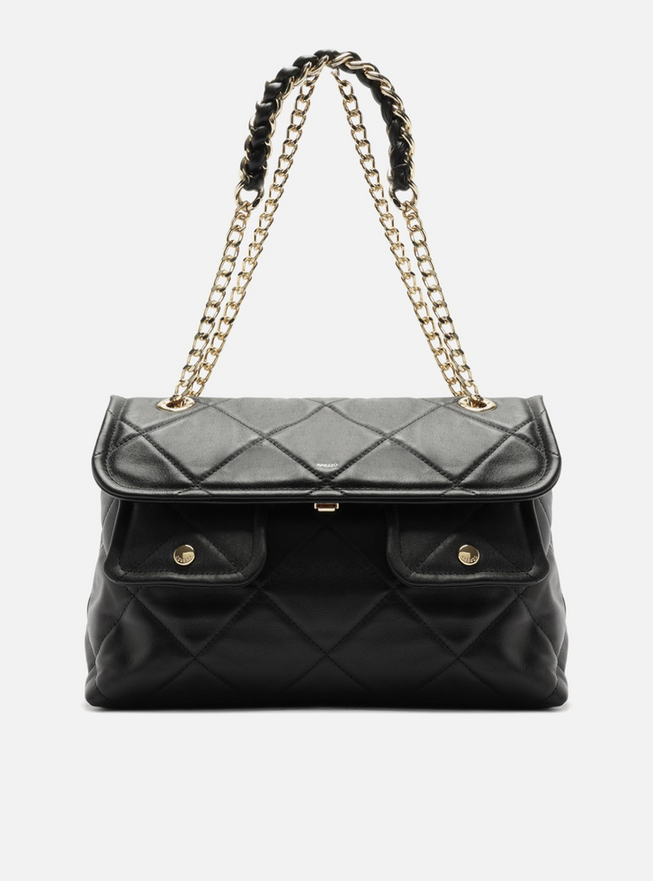 Bolsa feminina shoulder grande preta de couro. O acessório tem formato estruturado e acabamento em matelassê. Traz alça de ombro curta em corrente metálica com tira de couro entrelaçada. O fecho é em tampo frontal. Conta com bolsos sob o tampo e fecho em botões.