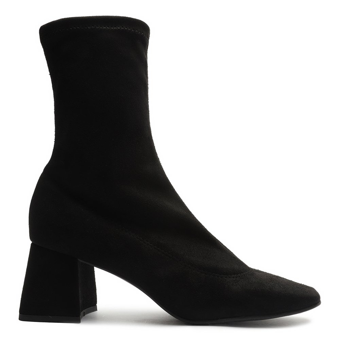 Bota preta skinny em tecido de suede. O modelo tem cano médio, salto médio bloco, revestido em suede, e bico quadrado. Traz cabedal ajustado ao pé e cano com costuras discretas.