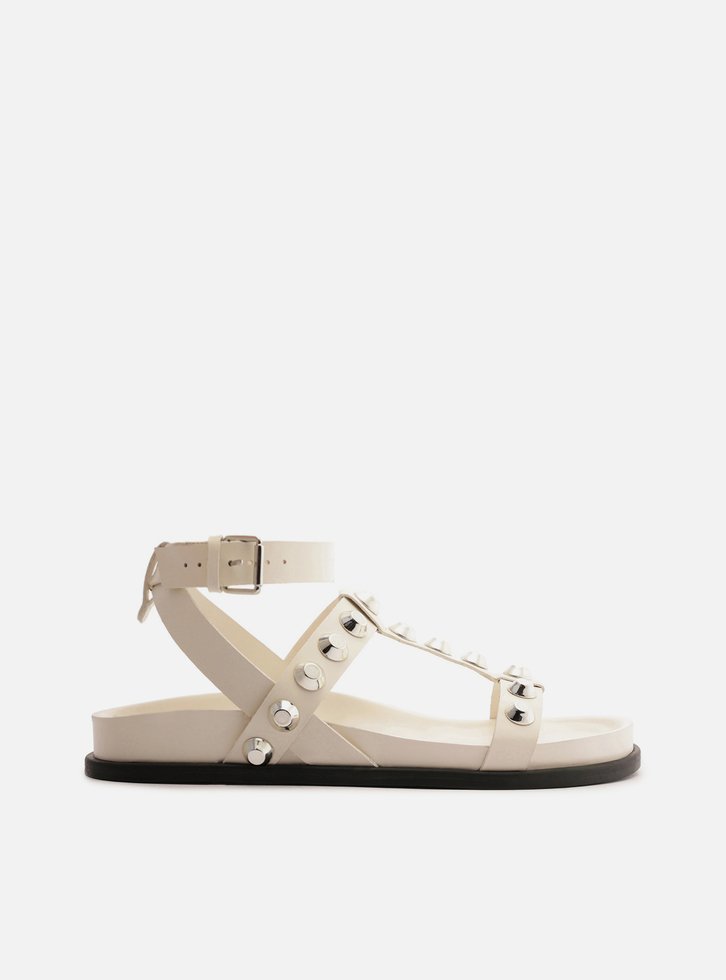 Sandália rasteira estilo Salomé confeccionada em couro branco, com acabamento em bico redondo. Possui tiras largas adornadas com spikes metálicos, fechamento com fivela no tornozelo e solado flat que garante conforto e estilo ao visual. Ideal para composições urbanas e ousadas.