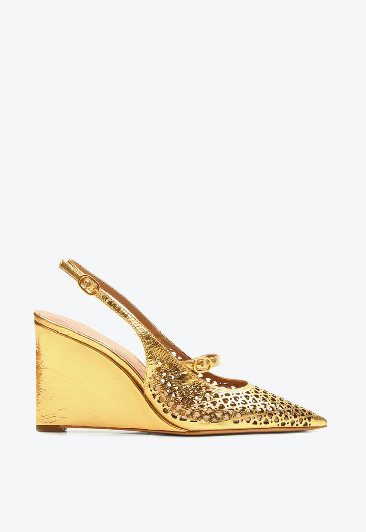 Slingback anabela Vitória de salto alto metalizado dourado. Com bico fino e recortes a laser em formato de coração, este modelo une delicadeza e originalidade ao design. O salto anabela proporciona conforto e estabilidade, enquanto a tonalidade realça qualquer produção. Perfeita para compor looks noturnos de verão, trazendo um toque de sofisticação, charme e estilo marcante aos visuais da temporada.