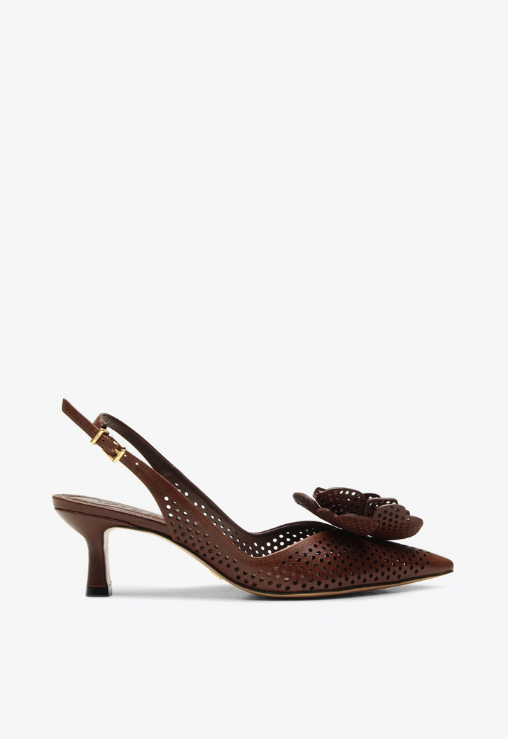 Slingback em couro marrom e adorno frontal. Com recortes delicados a laser e flor 3D, esse design revela detalhes que encantam pelo equilíbrio entre sutileza e inovação. Shape que traz o romantismo da temporada em um visual chique. Com construção leve e confortável, esse modelo é perfeito para quem busca um calçado marcante que renove o visual com charme e personalidade.