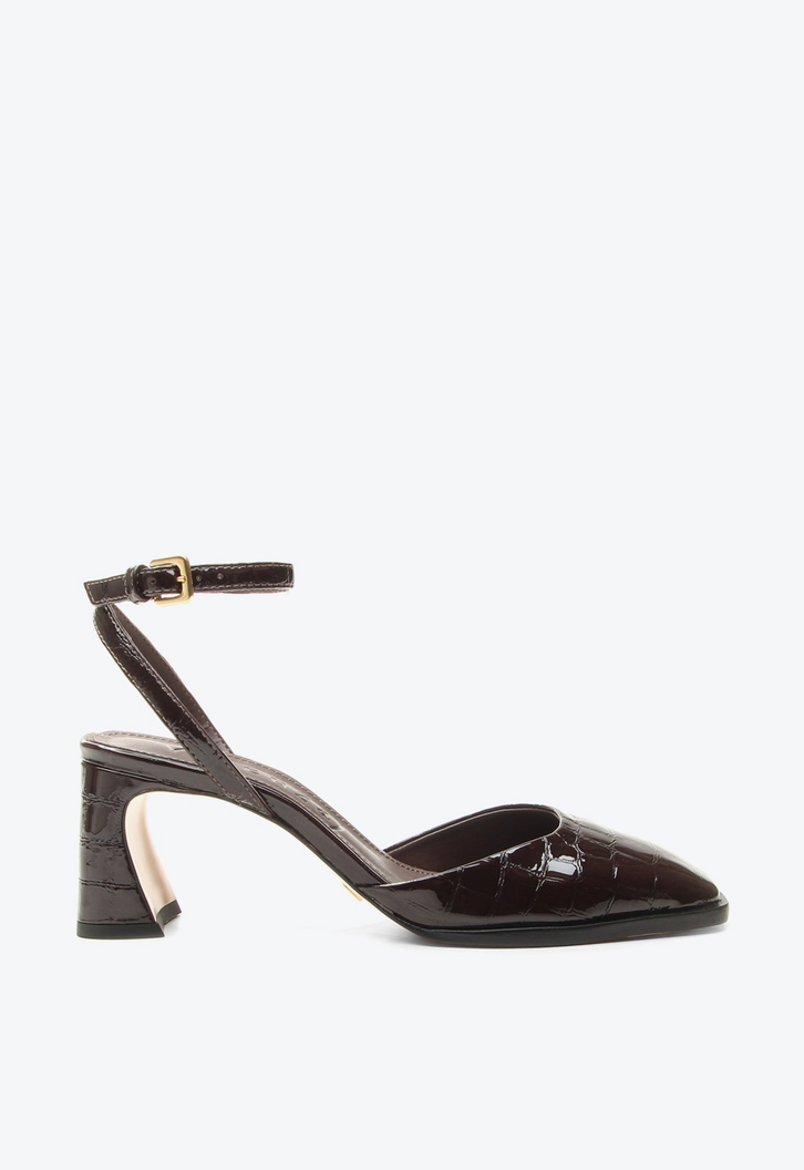 Slingback Gales Marrom traduz elegância minimalista com um toque contemporâneo. Em couro com textura croco gloss na tonalidade Soft Taupe, destaca-se pelo bico quadrado e pelo salto geométrico, que conferem um perfil arquitetônico ao modelo. A alça slingback com fivela ajustável garante um encaixe preciso, enquanto o acabamento envernizado valoriza a textura com sofisticação. Um design versátil e refinado, ideal para quem busca estilo discreto e atual em diferentes ocasiões.