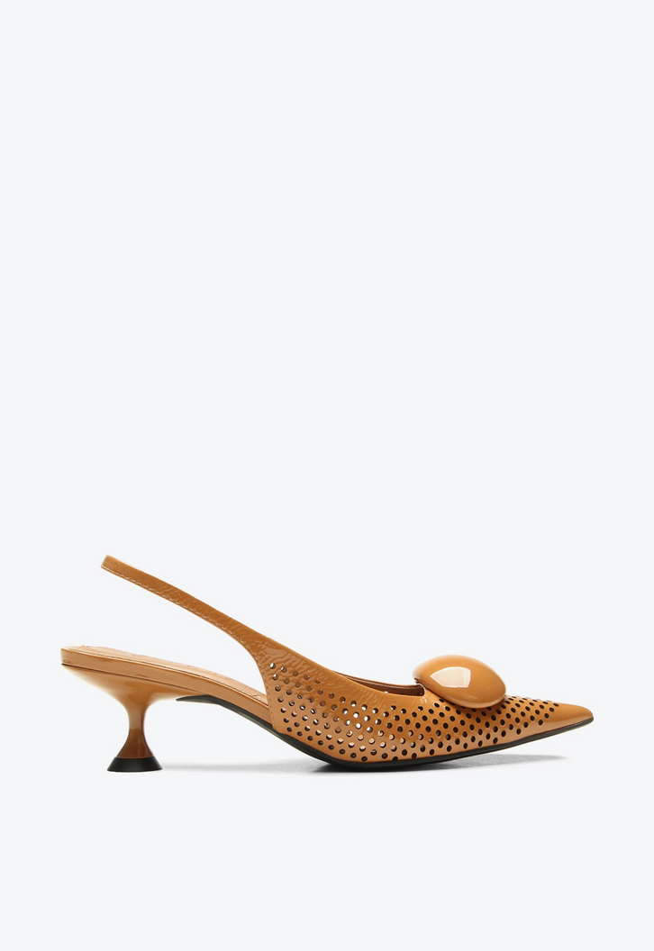 Slingback de salto médio em verniz caramelo. Os recortes a laser e o adorno frontal trazem um toque de sofisticação a este modelo que combina design clássico com funcionalidade. Leve, confortável e versátil, é uma peça indispensável no closet, perfeita para quem busca elegância descomplicada no dia a dia.