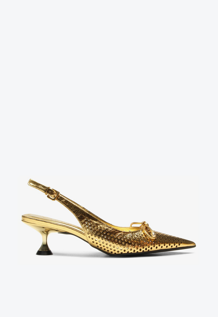 Slingback fechado de salto baixo em couro dourado. Com recortes a laser delicados e bico fino, traz um toque de sofisticação e modernidade. Sua construção oferece conforto o dia inteiro e o design elegante torna-o uma opção essencial para quem busca praticidade sem abrir mão de estilo. Perfeito para adicionar um brilho discreto ao look.