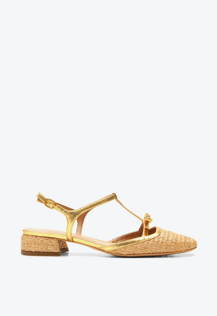 Slingback Panay de salto baixo dourado. Com bico fino arredondado e cabedal em estilo palha, esse modelo transmite delicadeza e romantismo em cada detalhe. As tiras finas e suaves completam o design, garantindo ajuste confortável e leveza ao caminhar. Perfeita para os dias mais quentes, combina frescor, charme e praticidade, sendo um calçado versátil que acrescenta um toque romântico e elegante às produções de verão.