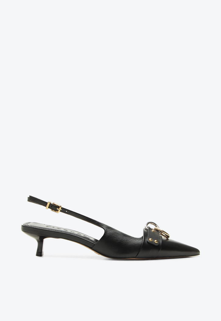 Slingback de salto médio em couro preto com bico fino e detalhes metalizados. Traz um design marcante combinado com a força dos metais e a elegância do couro, criando um visual poderoso e imponente. Ideal para quem busca um toque de modernidade e autenticidade no look. Se destaca em qualquer composição, seja para um look de trabalho ou happy hour. Vai bem com calças de corte reto, saias midi e casacos estruturados.