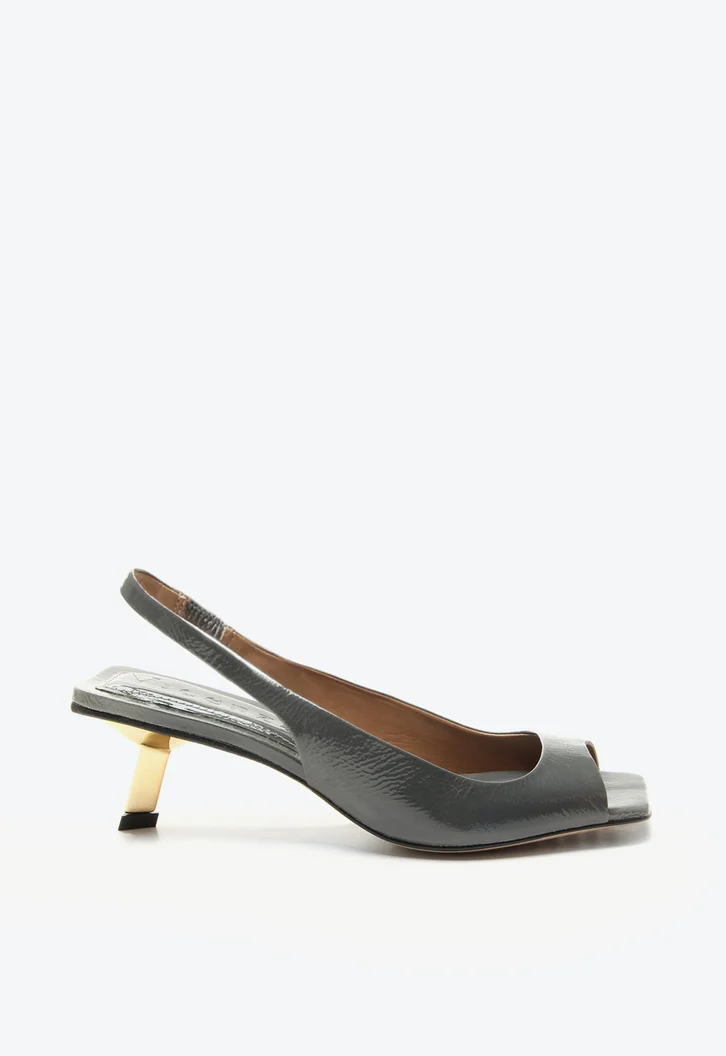 Slingback Vizela Cinza traduz o minimalismo com presença sofisticada. Em couro com acabamento verniz, destaca-se pelo bico peep toe quadrado e pelo salto metálico dourado de altura baixa, que adiciona um ponto arquitetônico ao design. O tirante slingback com elástico garante ajuste prático e confortável. Um modelo refinado e versátil, ideal para compor produções noturnas com estilo e modernidade.