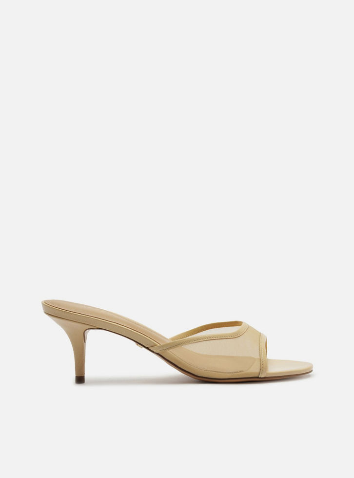 Sandália bege. O sapato tem salto médio fino e formato arredondado na ponta. Traz tira larga e única, mais larga nas laterais, sobre os dedos e a parte superior do pé, em tule e com bordas. Com palmilha bege e inscrição do nome da marca.