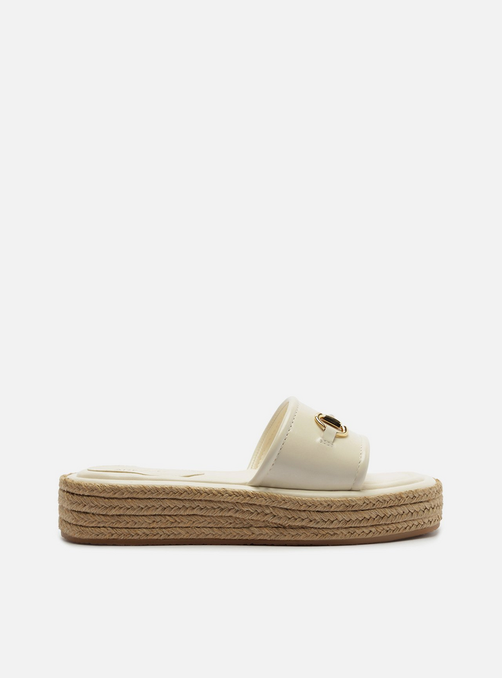Sandália feminina branca de couro. O sapato tem salto baixo flatform, revestido em corda trançada, e formato arredondado na ponta. Traz tira larga única em couro sobre os dedos e parte superior do pé, com aplicação de bridão metálico dourado. Com palmilha lisa branca de couro e inscrição do nome da marca.