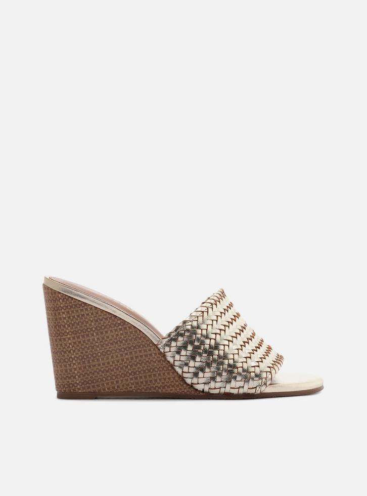 Sandália feminina dourada em tressê. O sapato tem salto médio anabela, em palha e ráfia, e formato arredondado na ponta. Traz tira larga única em tressê sobre os dedos e a parte superior do pé. Com palmilha marrom e inscrição do nome da marca.