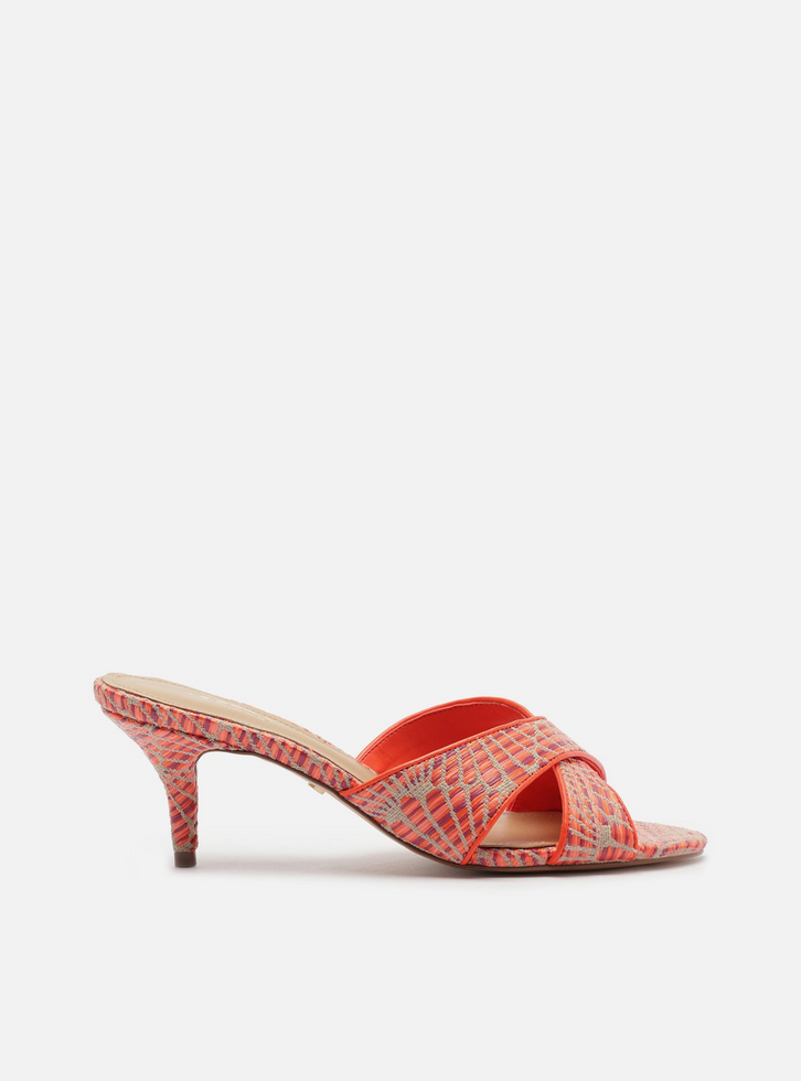 Sandália laranja com bordado tropical bege. O sapato tem salto médio fino e formato arredondado na ponta. Traz tiras cruzadas sobre os dedos e a parte superior do pé. Com palmilha bege e inscrição do nome da marca.
