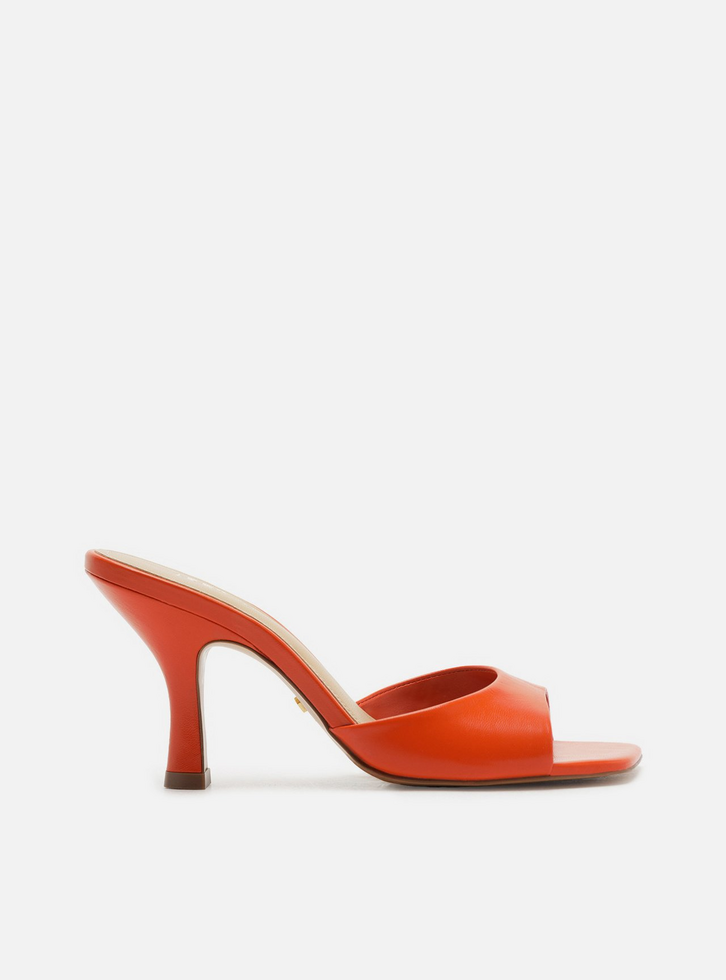Sandália laranja de couro. O sapato tem salto médio fino e ponta quadrada. Traz tira larga e única, mais larga nas laterais, sobre os dedos e a parte superior do pé. Com palmilha bege e inscrição do nome da marca.