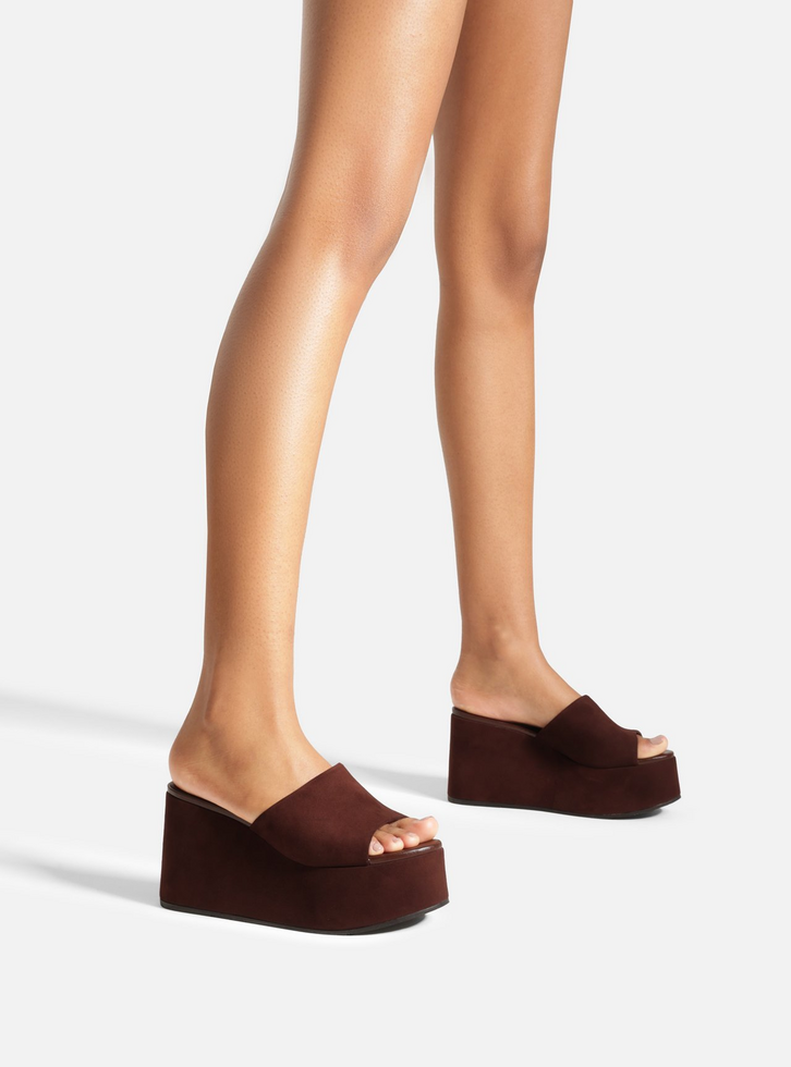 Sandália marrom em camurça. O sapato tem salto alto plataforma revestido no mesmo material e formato arredondado na ponta. Traz tira larga e única sobre a parte superior do pé. Com palmilha marrom lisa e inscrição Arezzo + TIG.