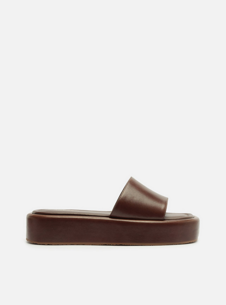 Sandália feminina marrom de couro. O sapato tem salto baixo flatform, revestido no mesmo material, e formato arredondado na ponta. Traz tira larga e única de couro sobre os dedos e parte superior do pé. Com palmilha lisa marrom de couro e inscrição do nome da marca.