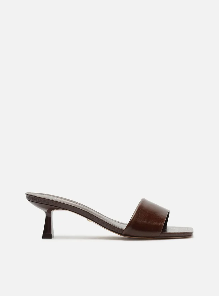 Mule feminina marrom de couro. O sapato tem salto baixo fino taça e ponta quadrada. Traz tira única sobre os dedos. Com palmilha lisa em couro e inscrição do nome da marca.