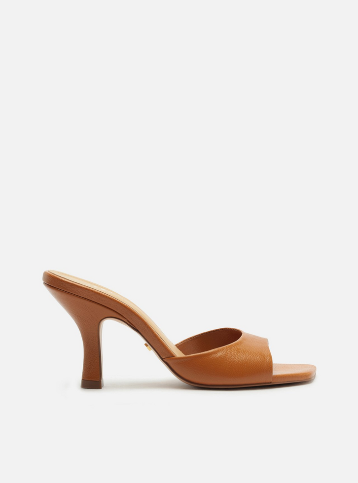 Sandália marrom de couro. O sapato tem salto médio fino e ponta quadrada. Traz tira larga e única, mais larga nas laterais, sobre os dedos e a parte superior do pé. Com palmilha bege e inscrição do nome da marca.