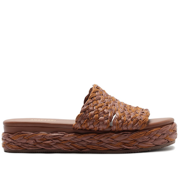 Sandália plataforma multineutra, com efeito trançado, em tons de marrom. Com solado flatform alto revestido em tecido de palha trançada, o modelo possui biqueira arredondada e traz duas tiras mais largas no cabedal - uma sobre os dedos e outra sobre o peito de pé, com o mesmo efeito trançado nas tiras. Apresenta palmilha acolchoada, com assinatura Anacapri. Aberta, o modelo deixa os dedos e calcanhar à mostra.
