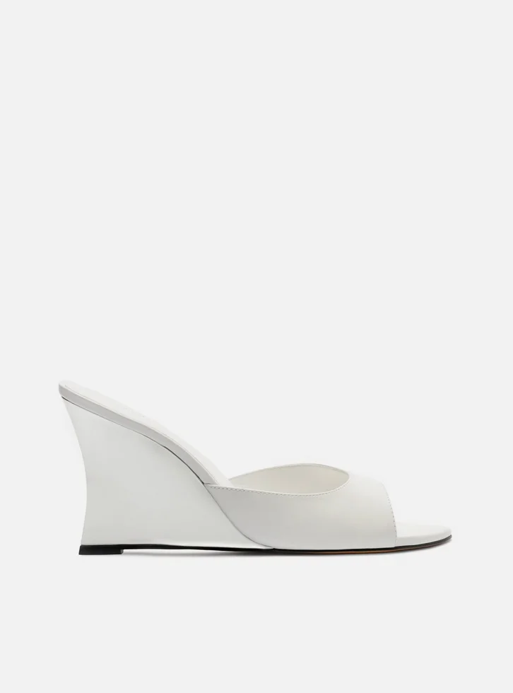 Tamanco feminino. O sapato tem salto alto anabela curvo e formato arredondado na ponta. Aberto, com palmilha lisa e inscrição do nome da marca. Exibe parte do pé.