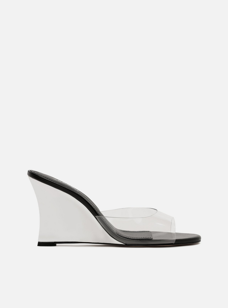 Tamanco feminino. O sapato tem salto alto anabela curvo e formato arredondado na ponta. Aberto, com palmilha lisa e inscrição do nome da marca. Exibe parte do pé.