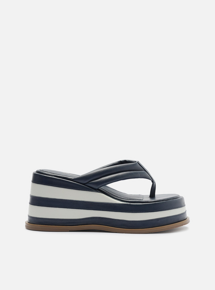 Sandália azul e branca listrada em couro. O sapato tem salto alto plataforma e formato arredondado na ponta. Traz tiras estofadas que dividem os dedos. Com palmilha da cor da sandália e inscrição do nome da marca.