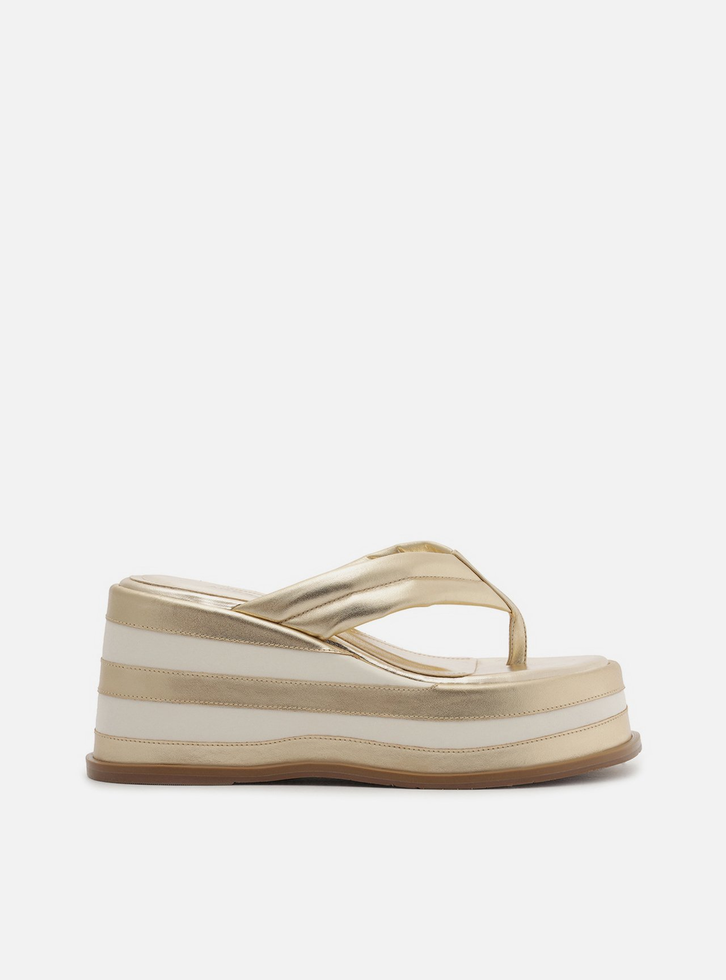 Sandália dourada e branca listrada em couro. O sapato tem salto alto plataforma e formato arredondado na ponta. Traz tiras estofadas que dividem os dedos. Com palmilha da cor da sandália e inscrição do nome da marca.