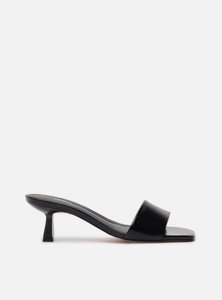 Mule feminina preta de couro. O sapato tem salto baixo fino taça e ponta quadrada. Traz tira única sobre os dedos. Com palmilha lisa em couro e inscrição do nome da marca.