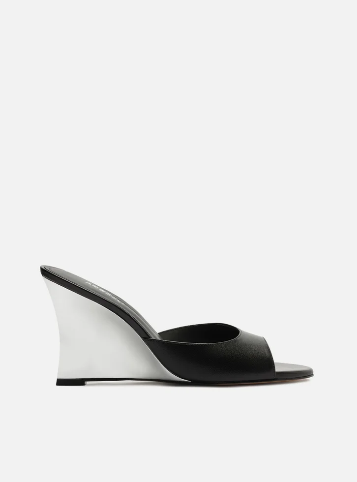 Tamanco feminino. O sapato tem salto alto anabela curvo e formato arredondado na ponta. Aberto, com palmilha lisa e inscrição do nome da marca. Exibe parte do pé.
