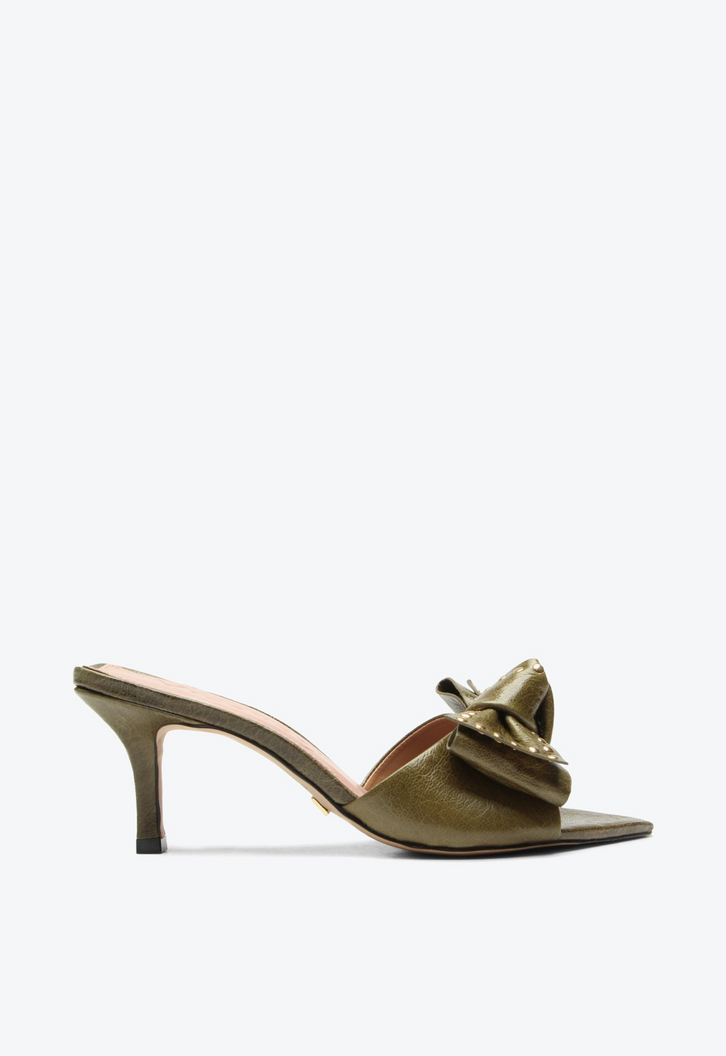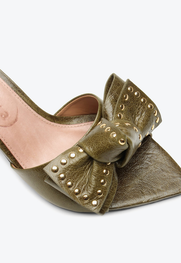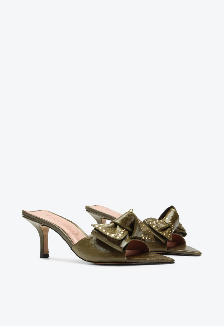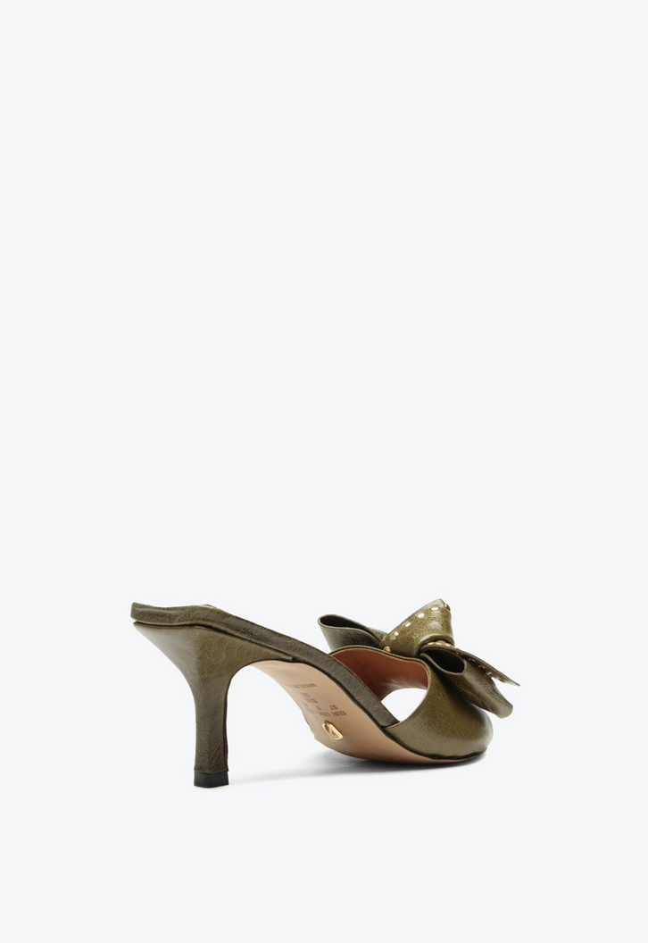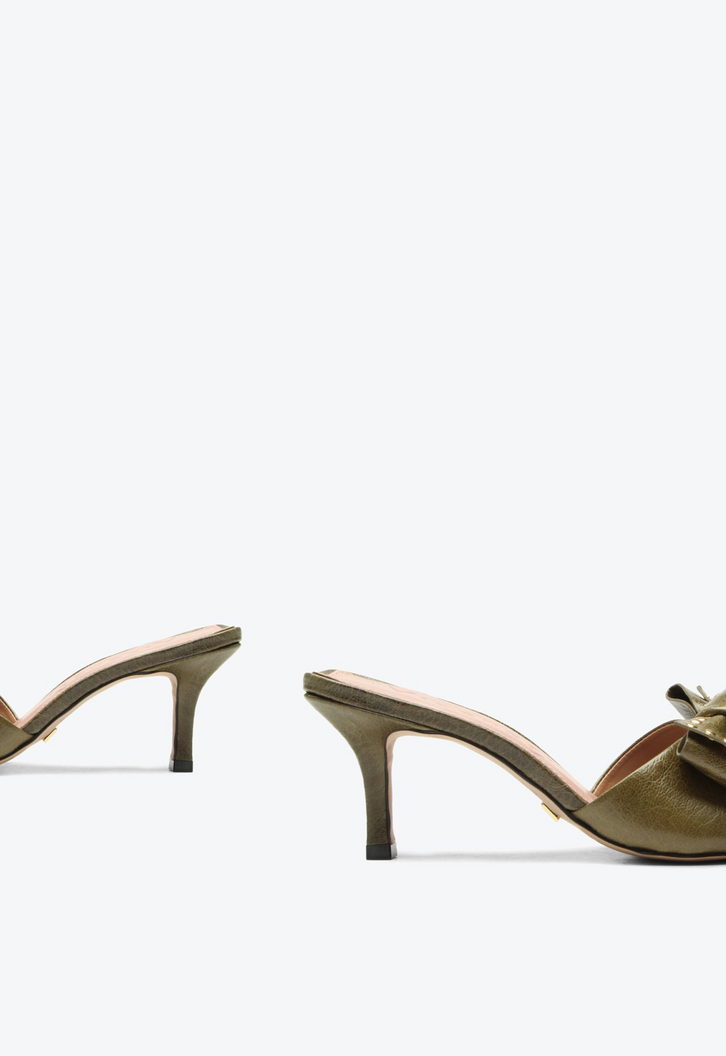 Tamanco de salto médio em couro cracked verde. Com design clássico e sofisticado, esse tamanco traz um bico estilo folha que confere delicadeza e elegância ao modelo. O laço frontal com aplicações metalizadas destaca-se como um detalhe refinado, agregando charme e personalidade ao calçado. Perfeita para compor looks versáteis, que vão do trabalho a ocasiões sociais com muito estilo. Uma escolha atemporal para quem valoriza qualidade, beleza e praticidade.