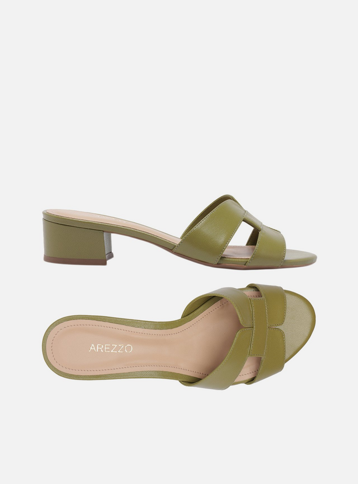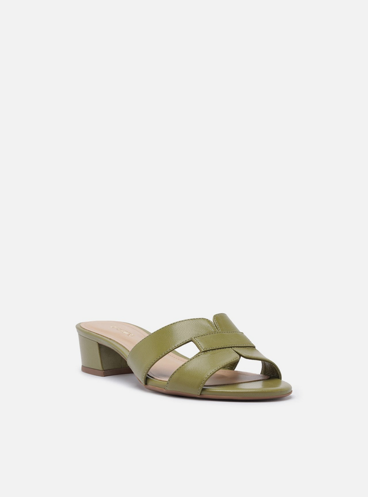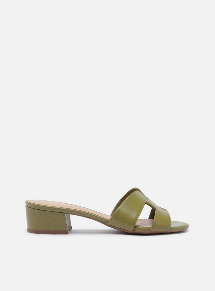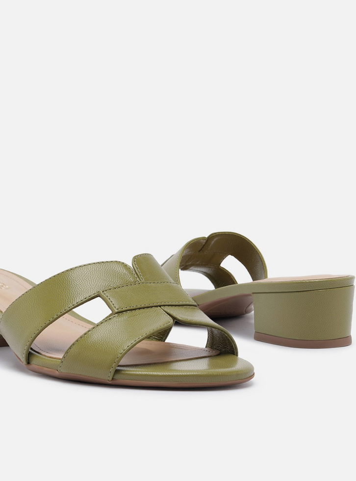 Sandália feminina de couro verde. O sapato tem salto baixo bloco e formato arredondado na ponta. Traz cabedal em tira única e vazada, além de costuras pesponto por todo o contorno. Com palmilha bege e inscrição do nome da marca.