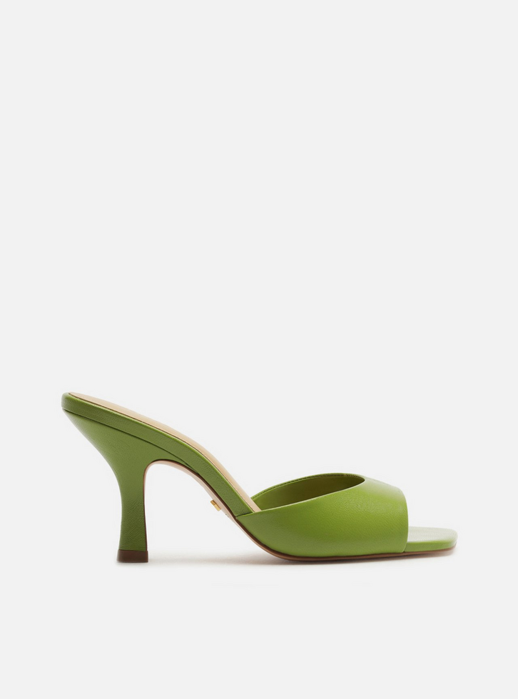 Sandália verde de couro. O sapato tem salto médio fino e ponta quadrada. Traz tira larga e única, mais larga nas laterais, sobre os dedos e a parte superior do pé. Com palmilha bege e inscrição do nome da marca.