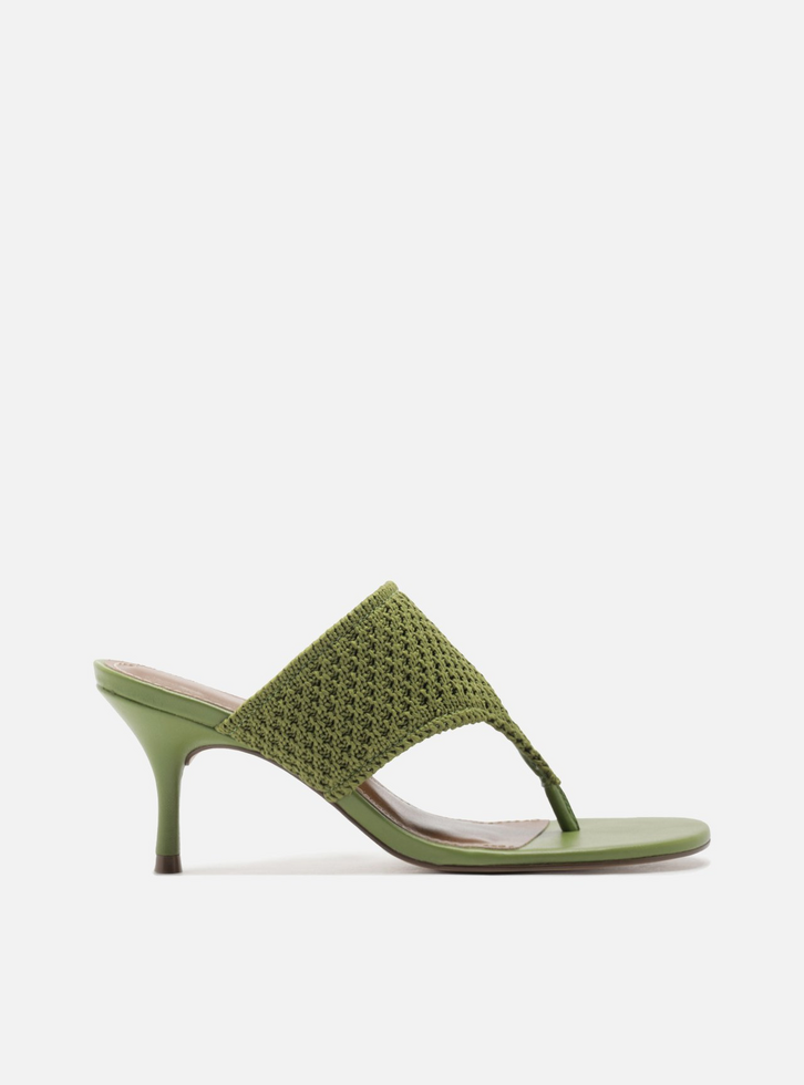 Sandália verde em crochê. O sapato tem salto médio fino, revestido em palha trançada tingida de verde, e formato arredondado na ponta. Traz tira larga em crochê que divide os dedos e cobre parcialmente a parte superior do pé. Com palmilha lisa marrom e inscrição do nome da marca.