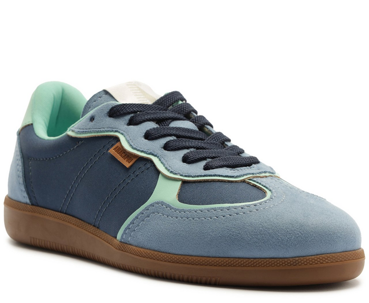Tênis A'25 Azul. De solado baixo emborrachado em goma nude vulcanizada, o modelo apresenta cabedal com mix de materiais: tecido de nylon e camurça. Traz novidade na construção - detalhe de costura pesponto imponente nas laterais e contornos, com design de recortes modernos e ondulados com peças em marrom contrastante, aplicadas na biqueira, na parte traseira e na lingueta. De amarrar, com atacadores brancos, possui parte interna forrada em marrom. Com tag lateral marrom Anacapri. O tênis traz a nova etiqueta tecida Anacapri aplicada na lingueta: branca, com design moderno e urbano, o modelo A'25 - nome que leva o ano de lançamento.
